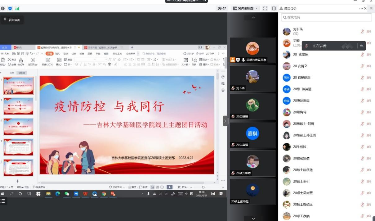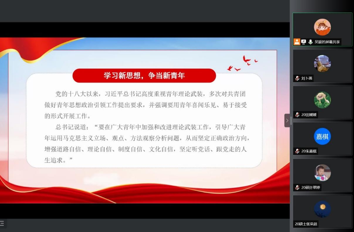 为更好地助力院校两级疫情防控工作,发挥广大青年团员主力军的作用,2022年4月12日,丝袜av 2020级硕士团支部在线上开展了“疫情防控,与我同行”主题团日活动。学院团委负责人、研究生辅导员孙佳钰老师以及2020级硕士全体团员参加,活动由2020级硕士团支书吴颖主持。
