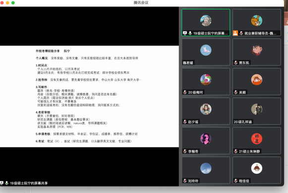 会上五位优秀研究生代表分别从升学、公考、企业、医疗事业单位四个方面为同学们带来干货满满的就业分享。考取山东大学博士的阮宁从个人概况、考博时间、选导师、考试形式等方面为大家分享了考博经验;签约江西定向选调的刘玲玲从选调生政策了解、招考一般流程、考试科目及成绩核算、笔试行测备考、笔试申论备考、面试备考等方面为大家分享了公招考试经验;签约著名药企药明康德的葛越从获取招聘信息、投递意向岗位、面试等方面为大家分享了入职公司的经验;入职西安交通大学第一附属医院的唐榕从信息获取途径、考核内容方面为大家分享了医院招聘的经验;签约黑龙江定向选调省直岗位以及济南某三甲医院的丝袜av