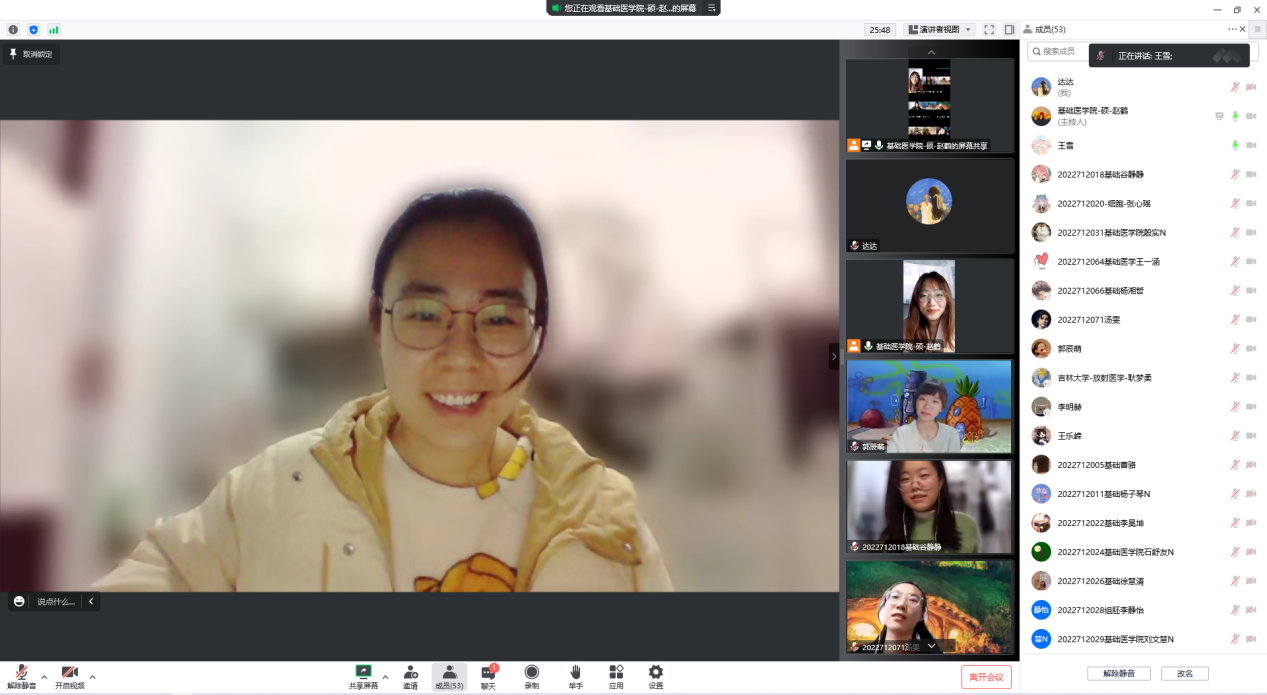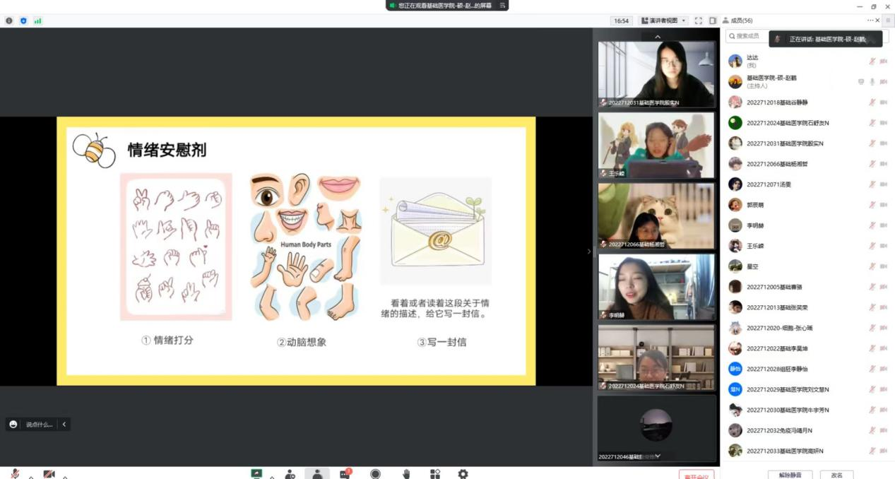 为了全面贯彻党的教育方针、推进素质教育,加强和改进大学生心理健康,提高大学生心理调节能力,培养良好心理品质,促进大学生思想道德素质和心理健康成长,更有利于大学生的科学文化素质和身心健康素质的协调发展基础医学院学生朋辈心理辅导员1017日通过线上腾讯会议的方式,在2022级研究生班级中组织开展新生团体心理辅导活动。