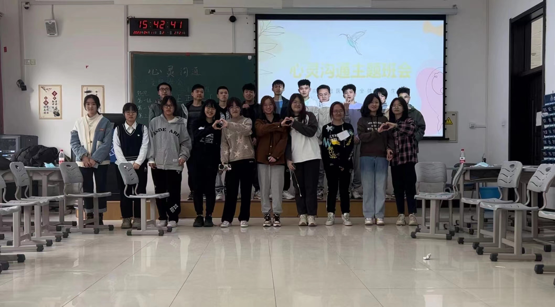 全体本科生在心理健康指导中心指导下,学办主任李东洋和朋辈心理辅导员朴炫旭的带领下,在李四光楼214教室开展了“心灵沟通”主题班会。