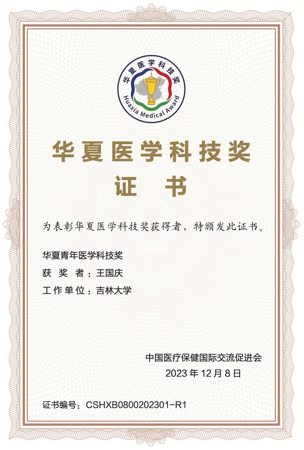 王国庆教授荣获华夏青年医学科技奖,是首次获此殊荣的15位青年学者之一。