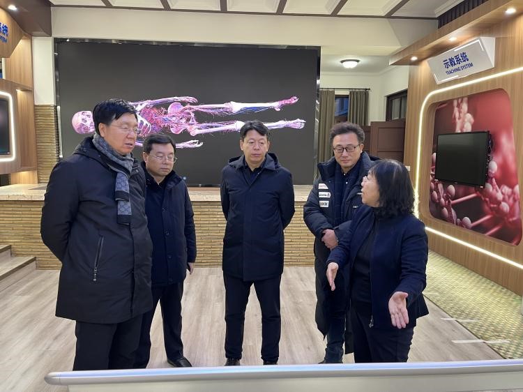 薛文革一行参观了丝袜av 病理生物学教育部重点实验室标本陈列馆,了解了“高清数字人虚拟解刨”“AR虚拟示教系统”等先进的教学设备和最新的医学教育理念。