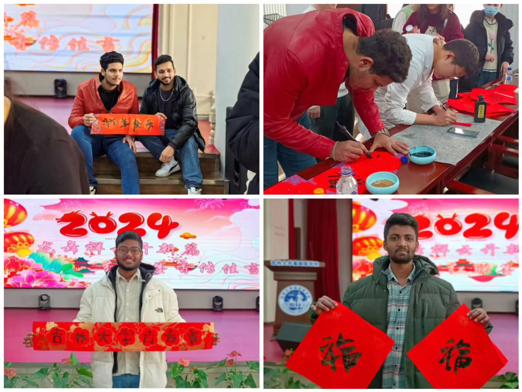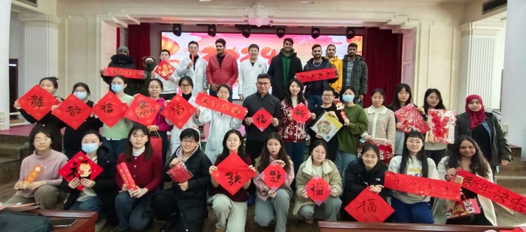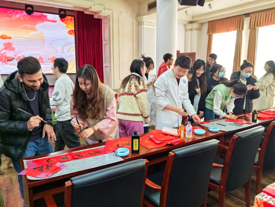 我院MBBS留学生们也踊跃参加,热情地加入到写春联的行列中来,一笔一墨、一横一竖、一撇一捺……切身感受中国传统文化的无穷魅力和浓浓的节日氛围。大家纷纷合影留念,共同感受喜庆的节日氛围。