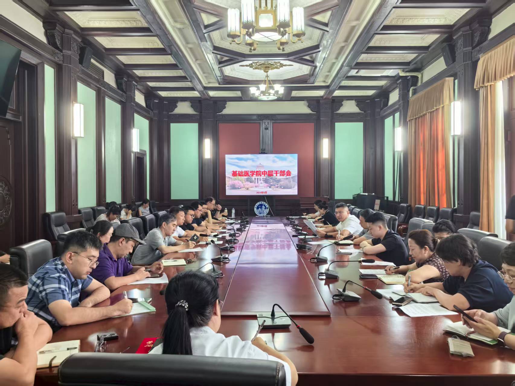最后,王晓荣书记要求,全院中层干部要认真贯彻落实田辉书记讲话精神,在总结学院学习教育的做法和成效基础上,全体师生要进一步提振精神、凝聚强大合力,全面加强党的领导,凝聚基础精神,推动基础医学学科高质量发展。她强调,学院党委将持续深入学习贯彻学校新学期工作会议精神,提高站位、勇担使命,坚持以干破题、实干兴业,带领学院师生拼搏进取、守正创新,不断探寻学院发展新思路,为学校建设中国特色、世界一流大学贡献基础力量。