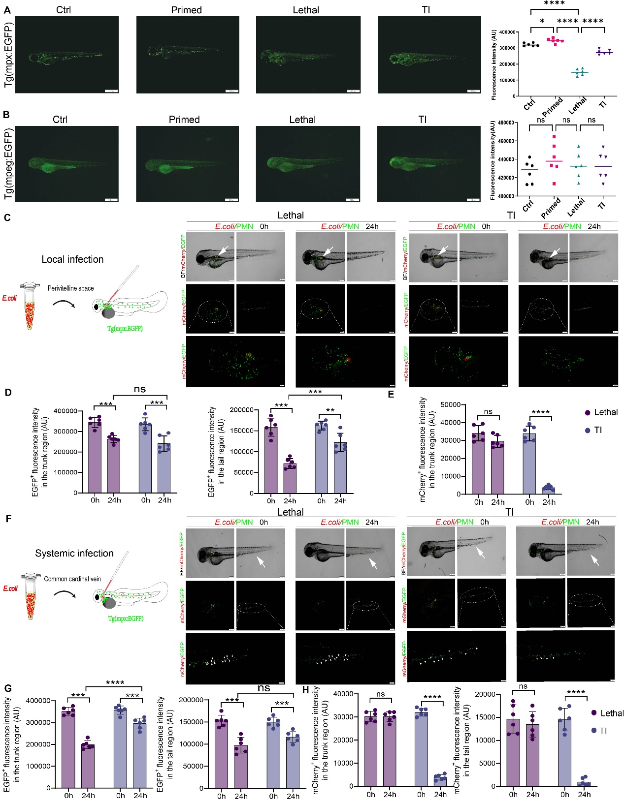 此外,研究团队在斑马鱼模型中进一步验证了这一机制的跨物种保守性。结果显示,低剂量预刺激或irf5 过表达均可增强中性粒细胞募集、聚集和细菌清除能力,并提高斑马鱼对致死性感染以及临床来源大肠杆菌、肺炎克雷伯菌和金黄色葡萄球菌感染的抵抗力。