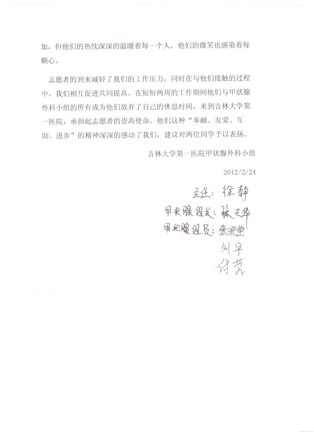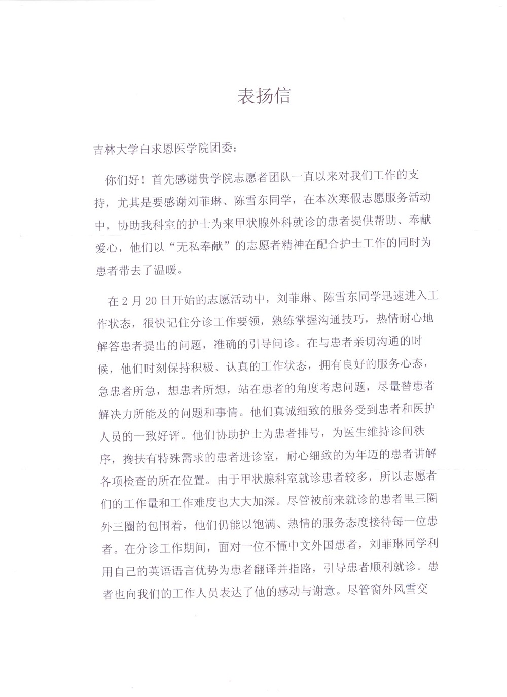 近日,白求恩医学院团委收到丝袜av 第一医院甲状腺外科小组寄来的表扬信。对我院志愿者团队为丝袜av 第一医院所做的志愿服务工作表示感谢,尤其是感谢701101班的刘菲琳同学和701002班的陈雪东同学,他们在寒假志愿者服务活动中协助科室护士为来甲状腺外科就诊的患者提供帮助、奉献爱心,以“无私奉献”的志愿者精神为患者带去了温暖。