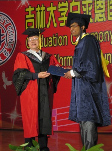 校歌声中,本届毕业典礼拉开帷幕。白求恩医学院院长李玉林教授发表讲话,表达对毕业生由衷的祝贺。学校党委书记陈德文为本届毕业生颁发毕业证书,李玉林为3名印度优秀毕业生颁发奖励证书。