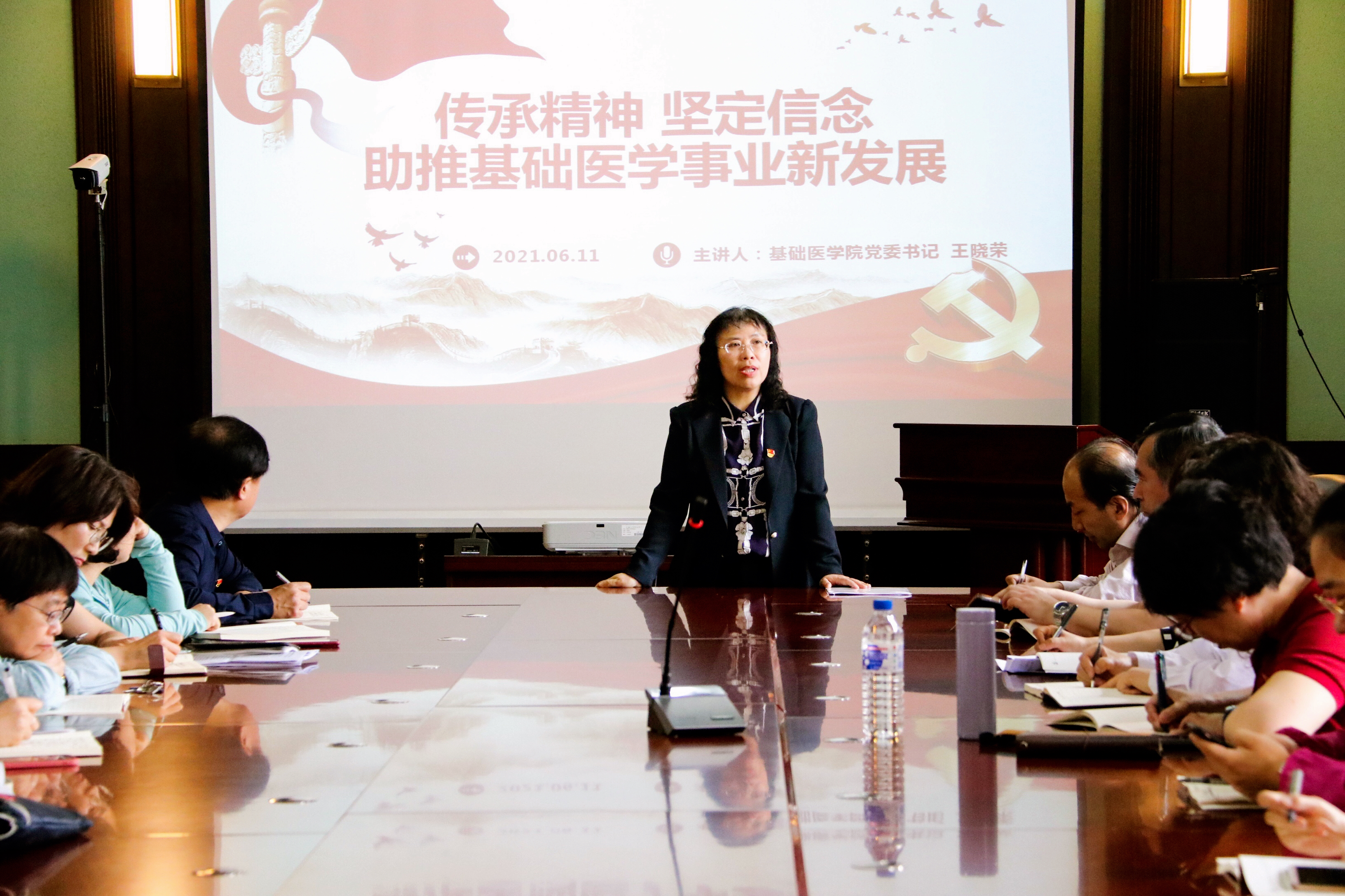 王晓荣书记带领大家从“两个务必”讲起,从共产党人的初心、使命和奋斗目标讲起,她与全体党员共同交流:2021年是极其特殊的年份,既是庆祝我们党百年华诞的重大时刻,又是十四五开局之年,是“两个一百年”奋斗目标历史交汇的关键节点,百年未有之大变局给共产党员提出了问题与挑战,她深入浅出的解读了党史学习教育的重要性。最后,王书记结合学院历史和发展的现状以及党史学习教育的核心内涵总结了学院精神。她指出学院精神是由三种精神融合而来,即白求恩精神、革命军队的优良传统以及学院建院精神,最后形成了基础医学人艰苦创业、服务国家、顾全大局的奋斗精神,形成了孜孜不倦、严谨求真、开拓创新的科学精神。2021年是丝袜av