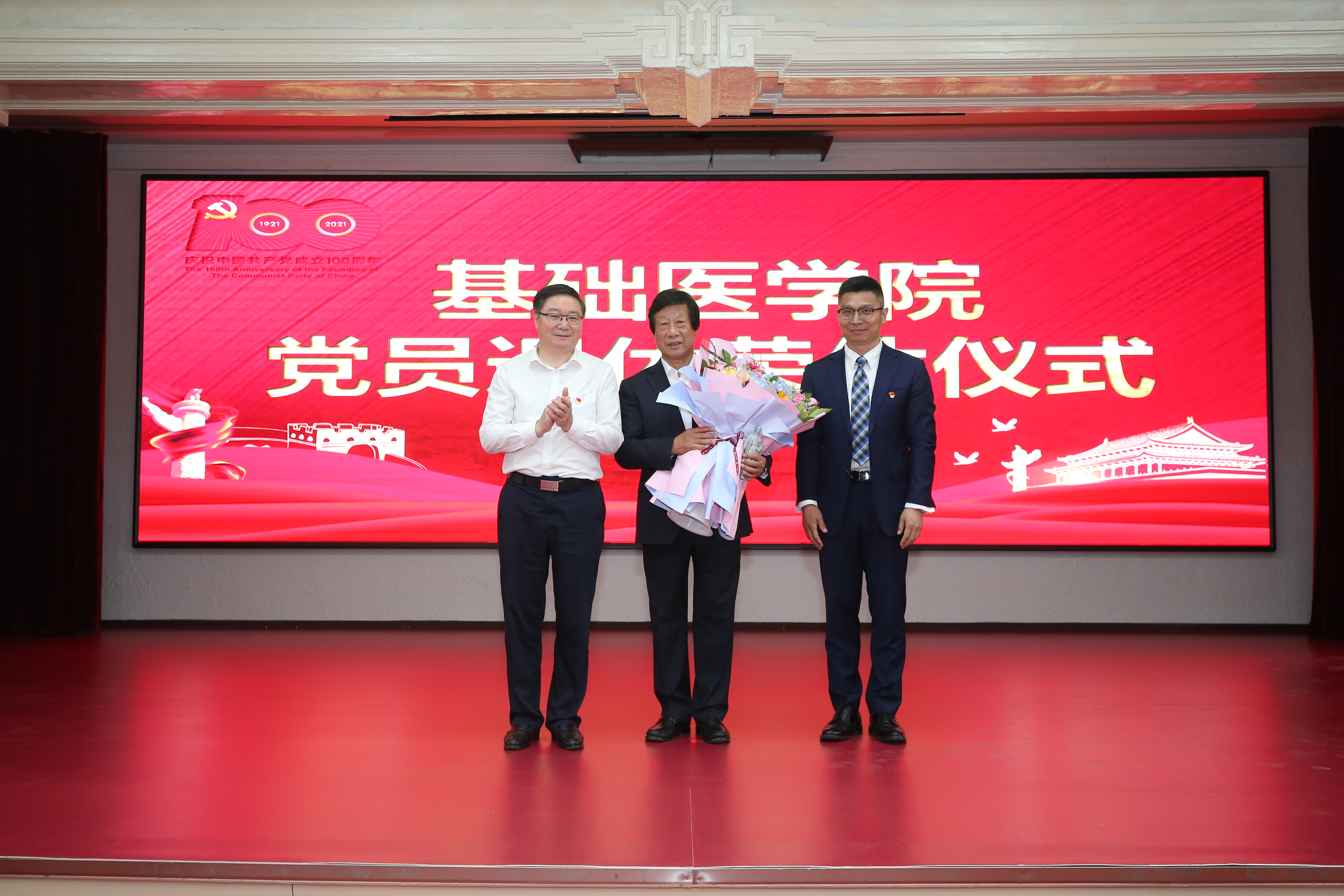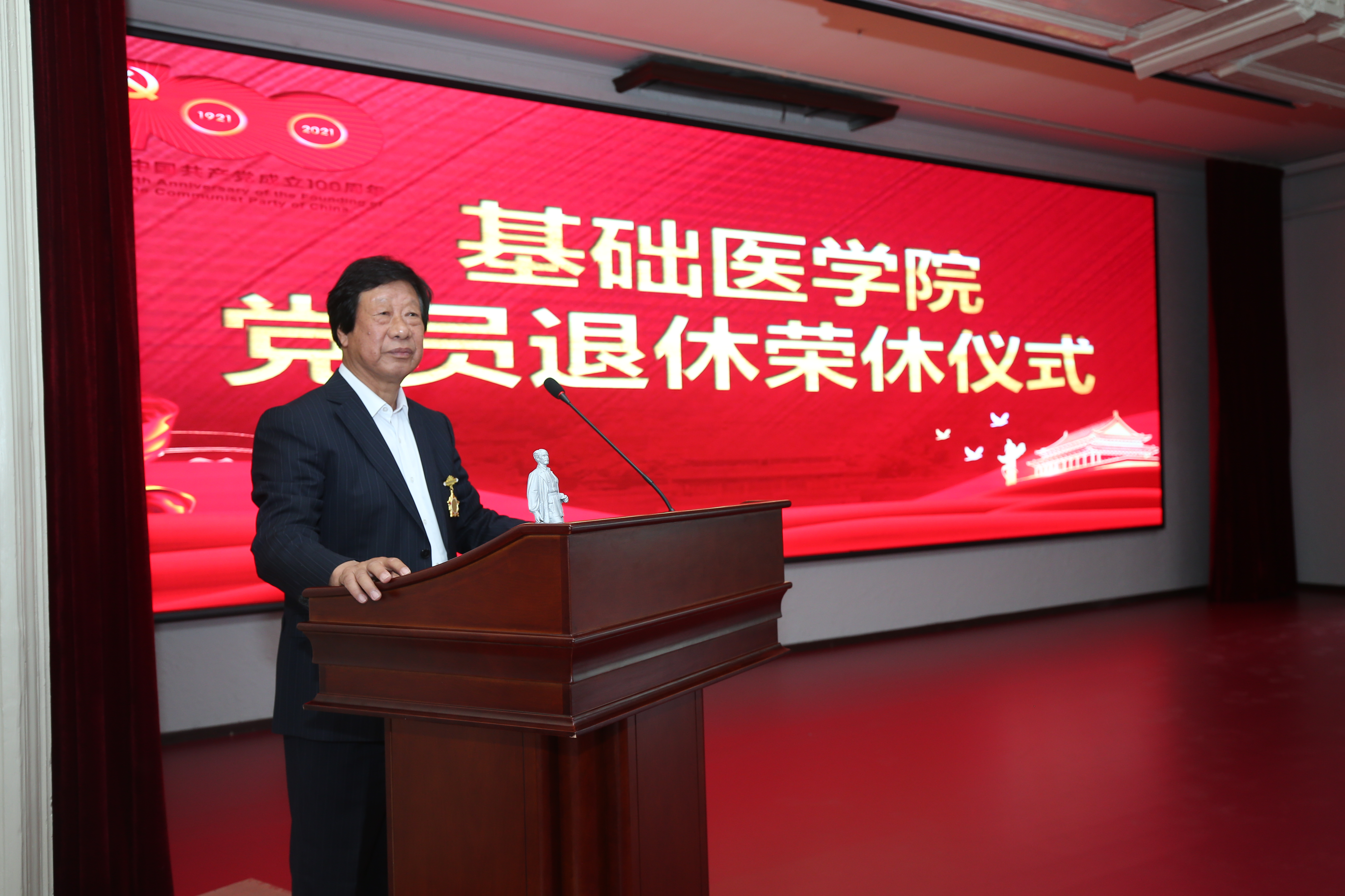 首次党员退休荣休仪式。王晓荣书记介绍了2021年退休的李玉林、李一、王琳三位党员教授的基本情况,李玉林教授参加工作52年、党龄49年,李一教授和王琳教授党龄34年,赵国庆副校长为退休党员代表李玉林教授颁发纪念章和3D打印的同版白求恩小塑像,王放院长代表学院赠送了鲜花。李玉林教授在发言中讲到自己从一名知识青年到教授、博士生导师的奋斗经历,表达了热爱党和国家、热爱学校、热爱学院、热爱病理学科的真挚情感,展现了一名老共产党员的精神风范,得到现场师生的热烈掌声。