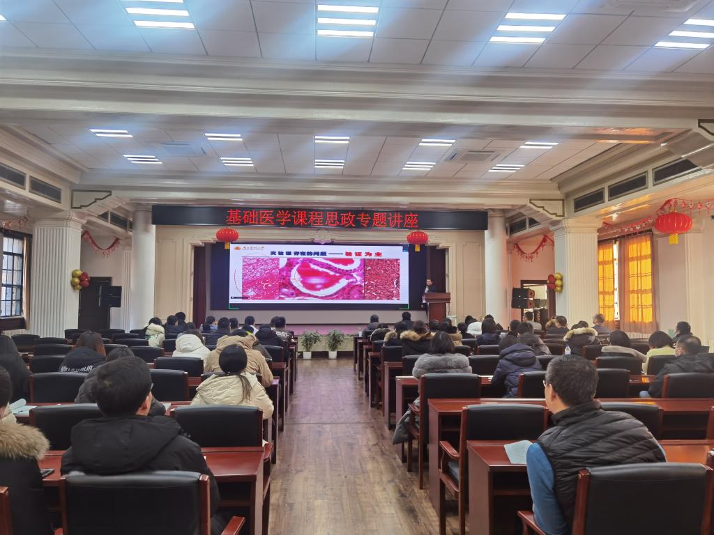 董为人教授通过创新之大变局和各项创新案例,介绍了课程思政如何润物细无声的融入到课程设计中,并对基础医学各课程与早期临床如何巧妙融合展开深度讨论。董教授指出,在课程建设方面,要有家国情怀,要学会内容创新、理念创新和模式创新;在教学设计方面,鼓励教师要学会引导学生以思维驱动学习,并要注意形成性评价效果,及时动态调整,适应学生发展;在教学内容方面,教师要充分发掘基础医学知识的特性,将疾病预防、健康指导等有机结合,真正做到医教融合。在座谈交流阶段,与会领导与教师积极发表自己的看法,并与董为人教授就“如何才能上好一门课”、“基础课程与早期临床的关系”、“整合课程如何调整优化”及“执业医师考试课程设计”等方面展开讨论与交流。