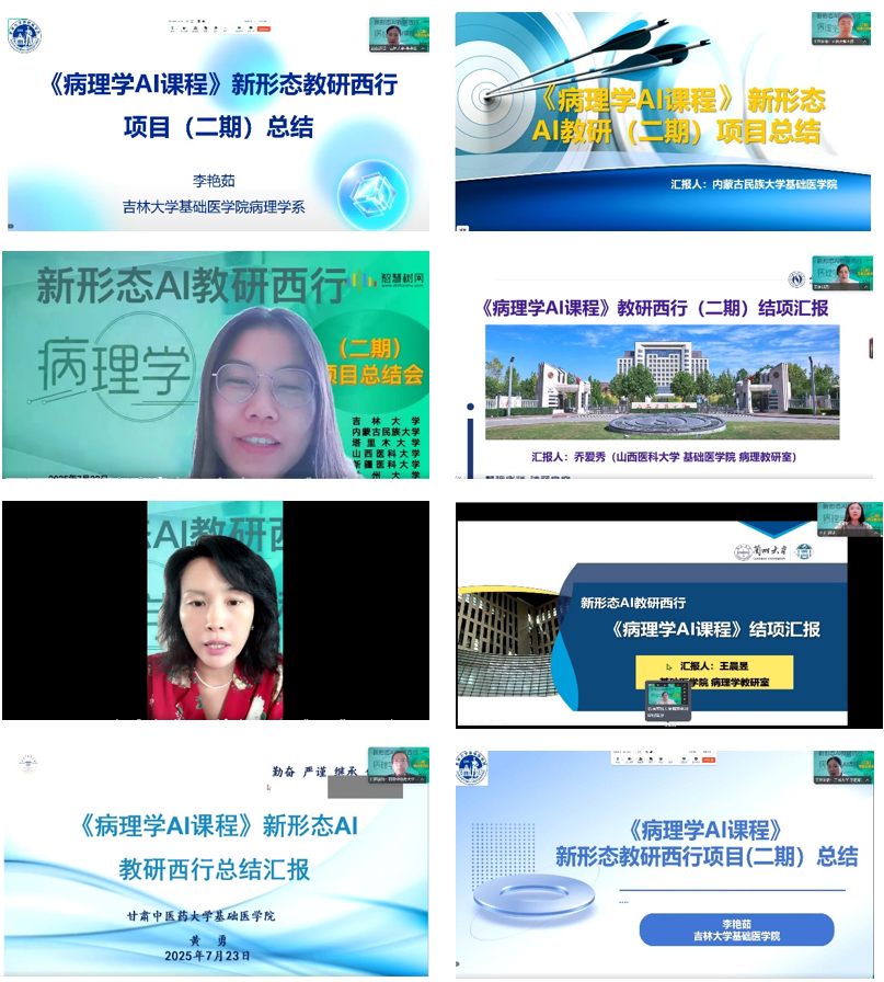 李艳茹、内蒙古民族大学张晓芬、塔里木大学吴亚楠、新疆医科大学马红、山西医科大学乔爱秀、兰州大学王晨昱、甘肃中医药大学黄勇等分别分享了本校在项目中的经验与成果。会上,项目主持单位代表李艳茹副主任对二期项目的整体实施与运行情况作了总结汇报。项目自2024年4月24日启动以来,历时15个月,组织了8次教师教研活动、3次三校联动的学生同步课堂直播教学,完成了病理学AI课程的版本升级,新增了AI助教与智慧学伴等人工智能教学工具。项目实施满意度调查显示,90%的参与者认为二期项目总体成效显著。